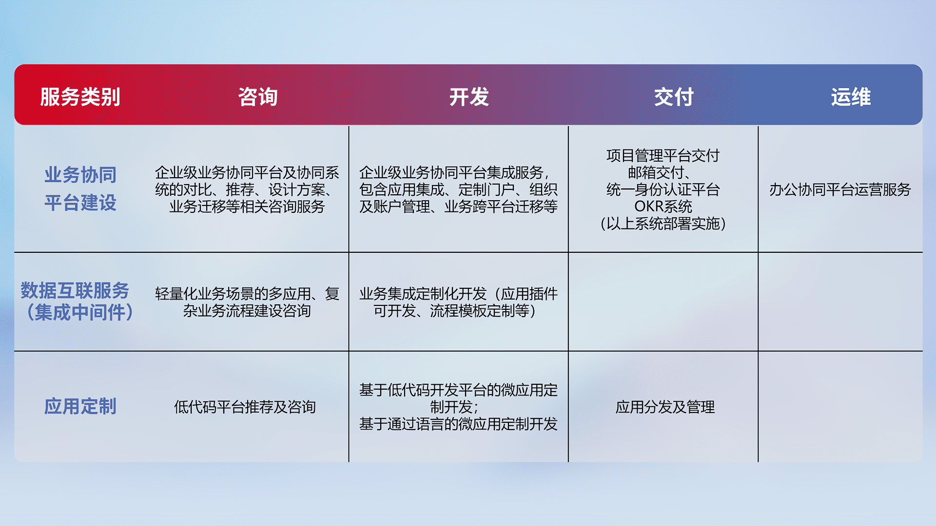 针对钉钉、、企微、、IDaas等平台级产品提供产品的规划、、、、方案、、、、交付、、、定制化开发等服务,,,,实现如统一协同办公、、智能客户服务、、混合会议管理、、、、智能数据查询、、、等业务场景,,,实现数字化转型。。。。